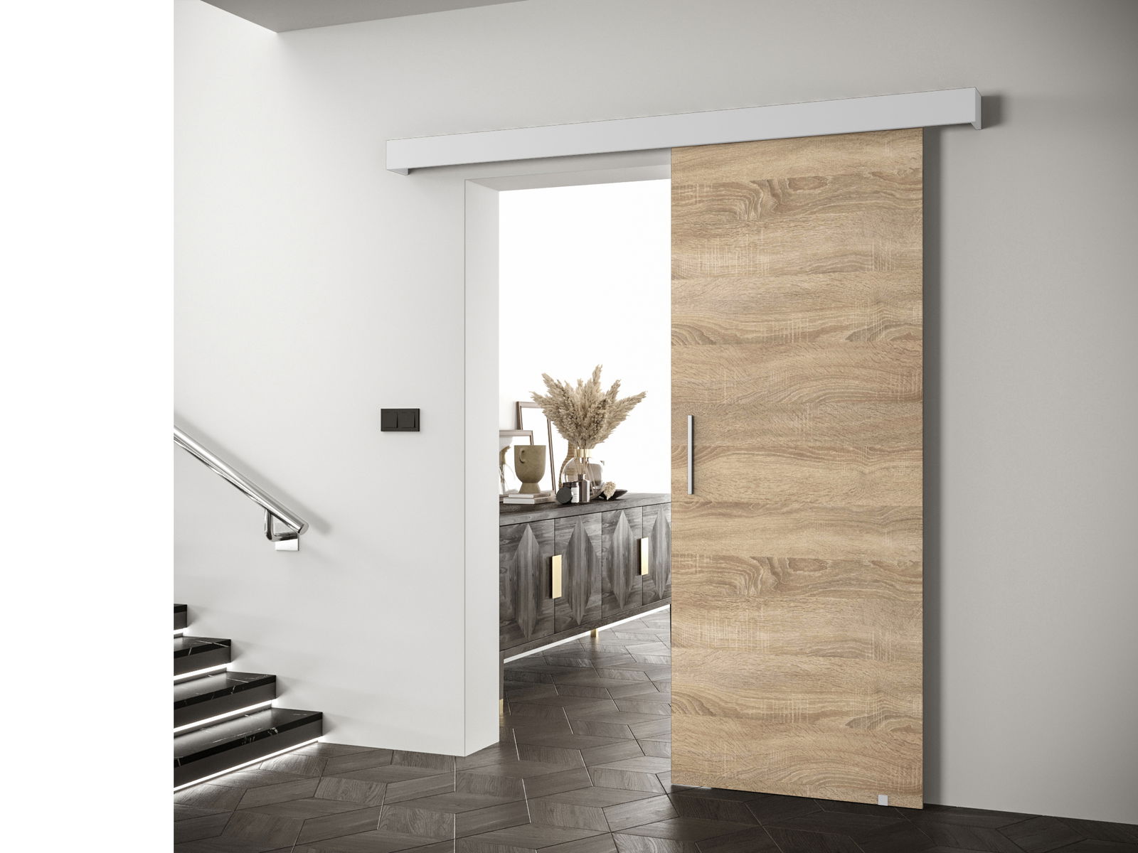Uși culisante 90 cm Sharlene I (stejar sonoma + alb mat + negru)