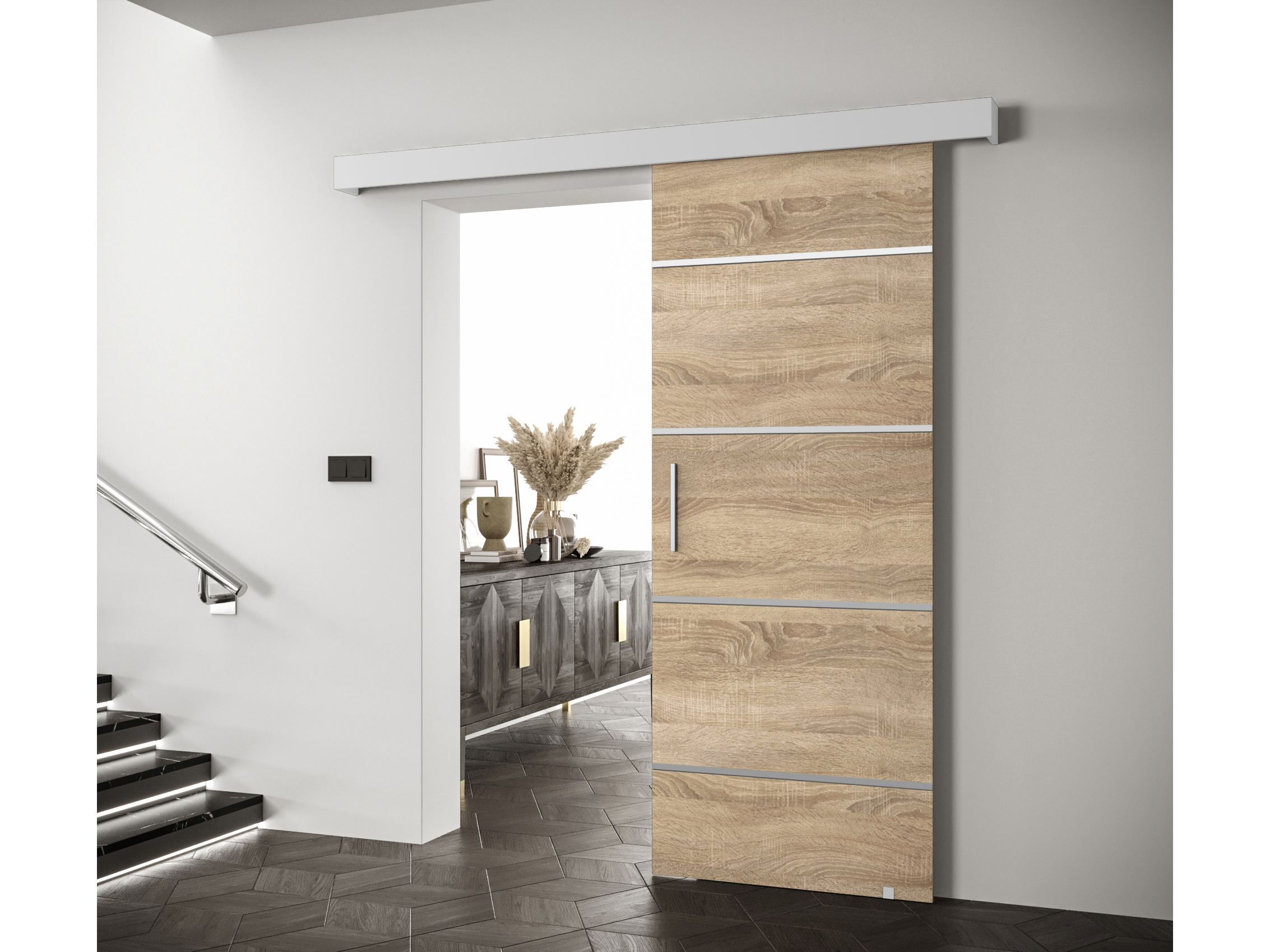 Uși culisante 90 cm Sharlene IV (stejar sonoma + alb mat + argintiu)