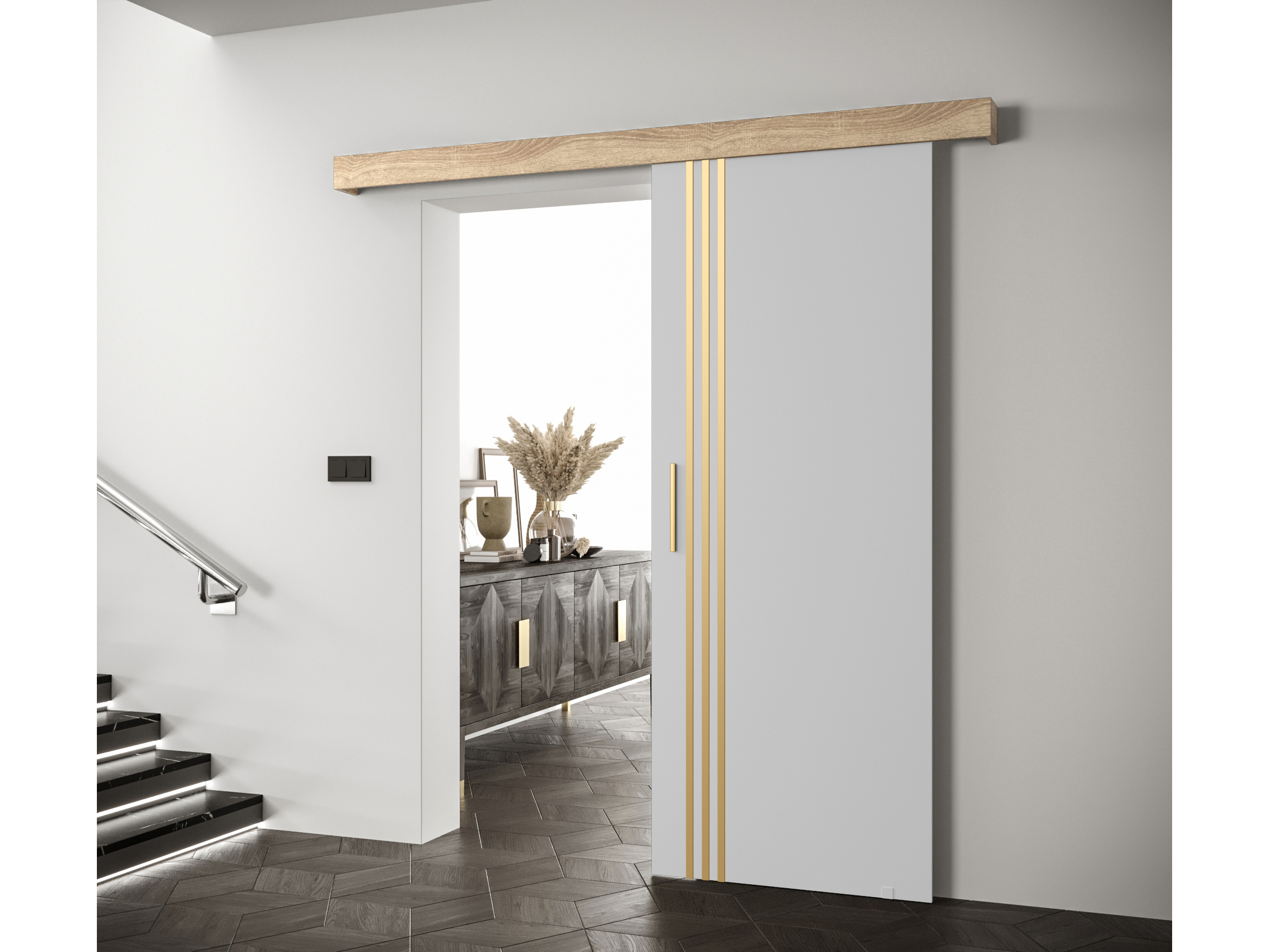 Uși culisante 90 cm Sharlene VI (alb mat + stejar sonoma + auriu)