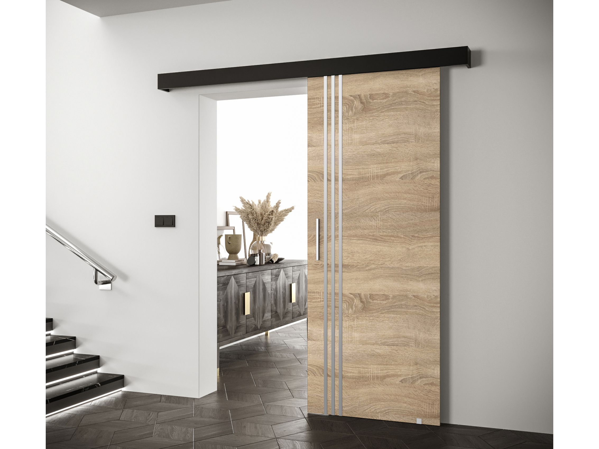 Uși culisante 90 cm Sharlene VI (stejar sonoma + negru mat + argintiu)