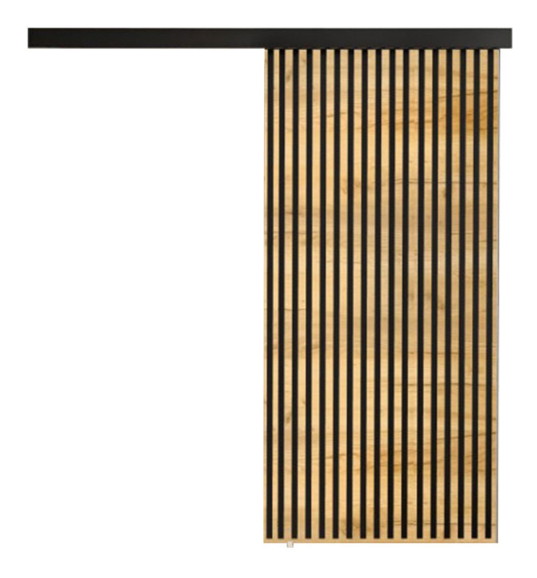 PAL laminat grosime 16 mm, canturi PVC grosime 0,5 mm, lamele din plastic negru grosime 2 mm autoadezive, fără mânere - ușa se deschide cu lamele, sistem de glisare Hercules, grilă superioară neagră mat, doar partea frontală este acoperită, lateralele sunt neacoperite, ușa are un poziționer care o menține într-o anumită poziție, foaia de ușă glisează pe o șină montată deasupra deschiderii ușii sub fațadă, panoul de acoperire iese 5,1 din perete, un dispozitiv de autoînchidere care previne impacturile la închidere este inclus în preț, spatele ușii este neted și fără inserții, ușa este fabricată din materiale de cea mai înaltă calitate, se poate monta pe partea stângă sau dreaptă (ușă universală)