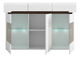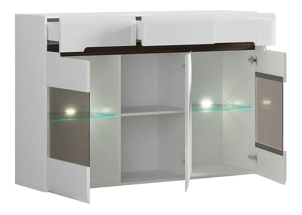 Vitrină atractivă cu trei sertare, două părți cu dulap și o parte sticlată și o parte închisă. Părțile vitrate conțin un raft de sticlă. Raftul este iluminat cu ajutorul iluminatului LED. Partea închisă a vitrinei conține un raft foliat. Ușile și sertarele au sistem de închidere silențios.