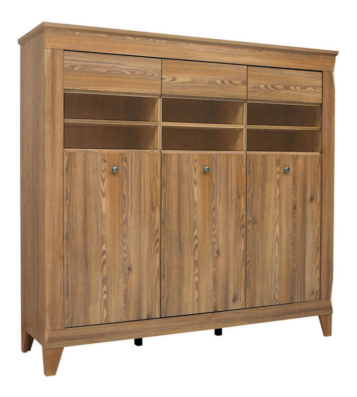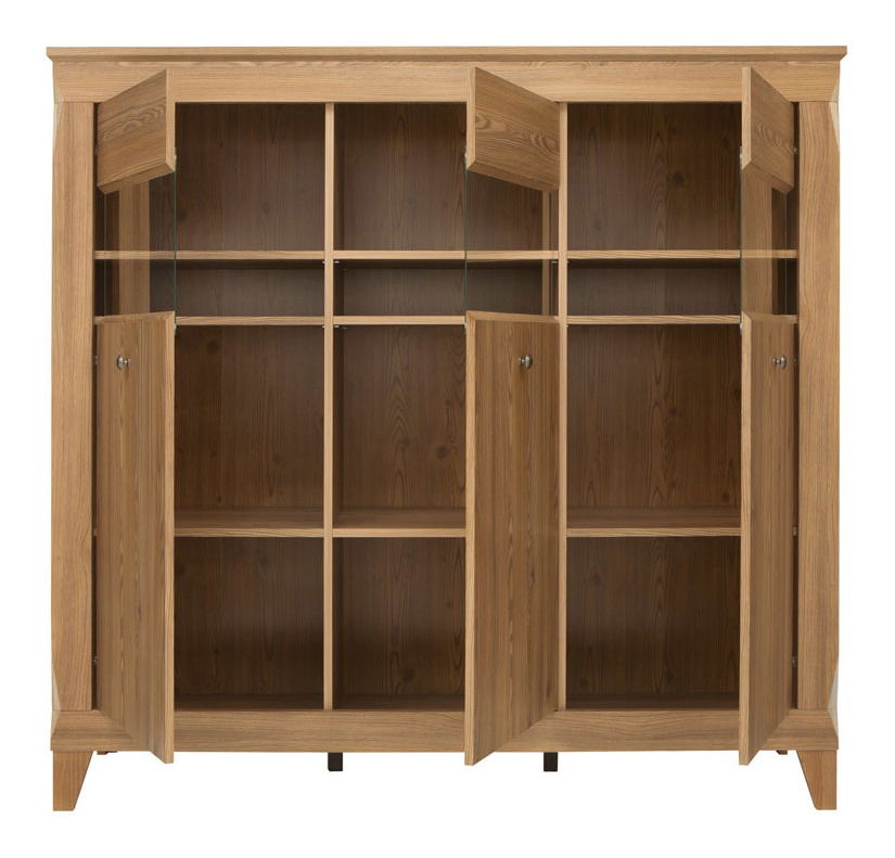 Vitrina Bergen cu trei uși, cu iluminare LED a rafturilor , scoate decent în evidență decorațiunile preferate fotografii sau altele. O parte a ușilor este vitrată dar o parte este plină , astfel încât o puteți utiliza și pentru depozitarea obiectelor de uz casnic. Vitrina elegantă este realizată din MDF , într-o nuanță de molid de sibiu auriu.