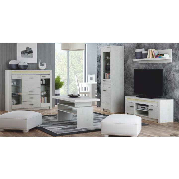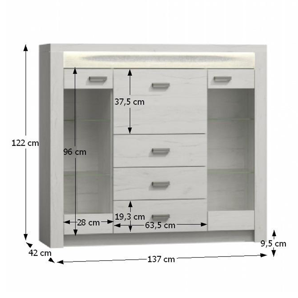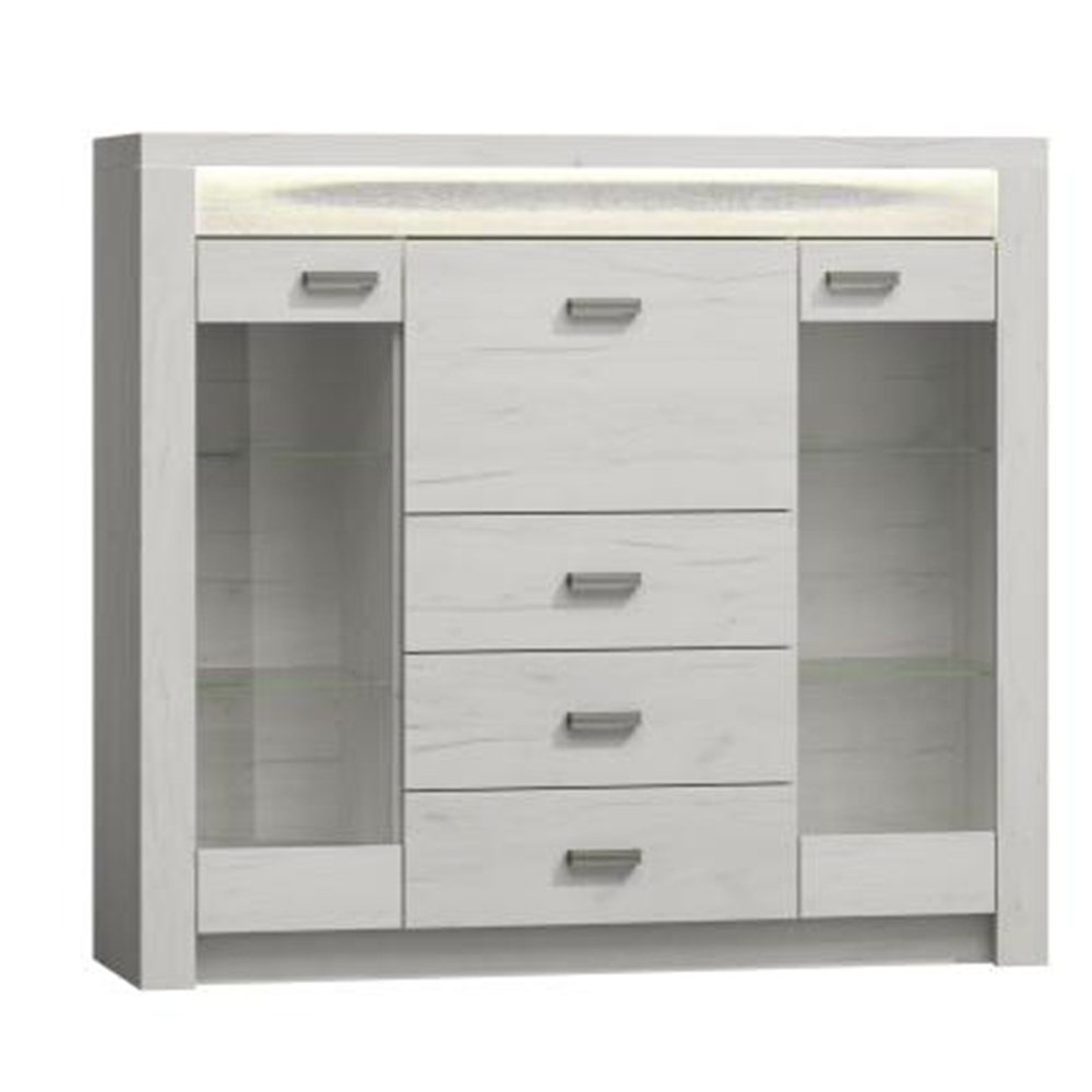 Vitrina Inneas va fi un accesoriu minunat pentru camera de zi. Vitrina are uși sticlate pe partea stângă și dreaptă în spatele cărora veți găsi două rafturi din sticlă. Pe mijloc se află 3 sertare și un dulap tip bar cu o parte rabatabilă. Pentru un efect unic recomandăm achiziția iluminatului LED.