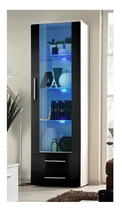 Vitrina Neo I este un accesoriu potrivit pentru fiecare cameră de zi sau birou. În partea inferioară se află două sertare, deasupra cărora veți găsi spațiul închis de o ușă din sticlă cu trei rafturi de sticlă. Pentru un efect unic recomandăm achiziția iluminatului LED.Corpul este mat, iar fronturile sunt lucioase.