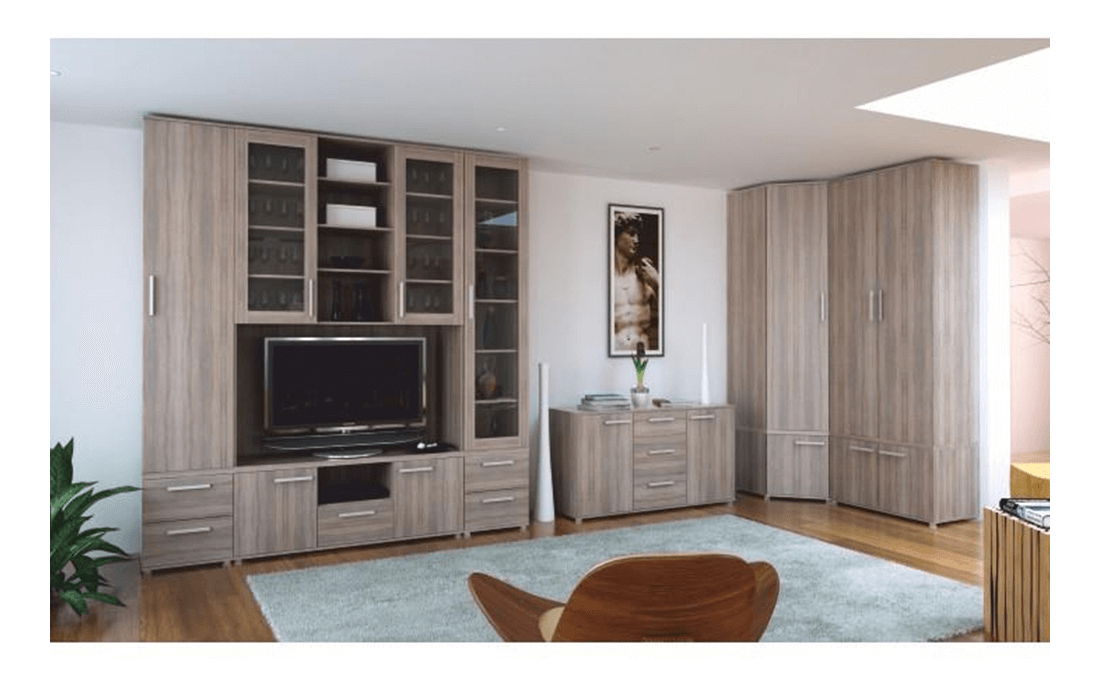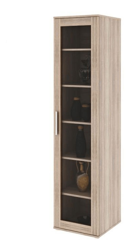 Vitrina înaltă cu un design simplu este potrivită pentru amenajarea camerei de zi sau a dormitorului. Versiunea color a vitrinei este stejarul sonoma. Vitrina este o extindere deasupra unui dulap mai mic.
