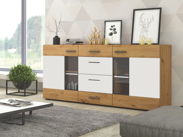 Vitrina spațioasă într-un stil modern este un accesoriu practic lângă Mobilierul living. Oferă suficient spațiu de depozitare. Este formată din trei piese, iar în interior se află 4 sertare și pe margini dulapuri cu uși parțial din sticlă. În fiecare dulap se află o poliță din sticlă. Un accesoriu modern și foarte efectiv este în ziua de azi iluminarea LED. Aceasta o puteți comanda și dvs. Va lumina frumos interiorul vitrinei și va scoate în evidență obiectele așezate în ea.